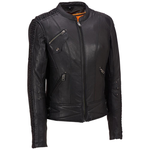 Boasting a studded bird decoration on the back, ruching down the arms, and genuine leather material all over, this leather moto jacket will take your look to new heights. All our jackets have an ageless attitude and a slim, modern fit.